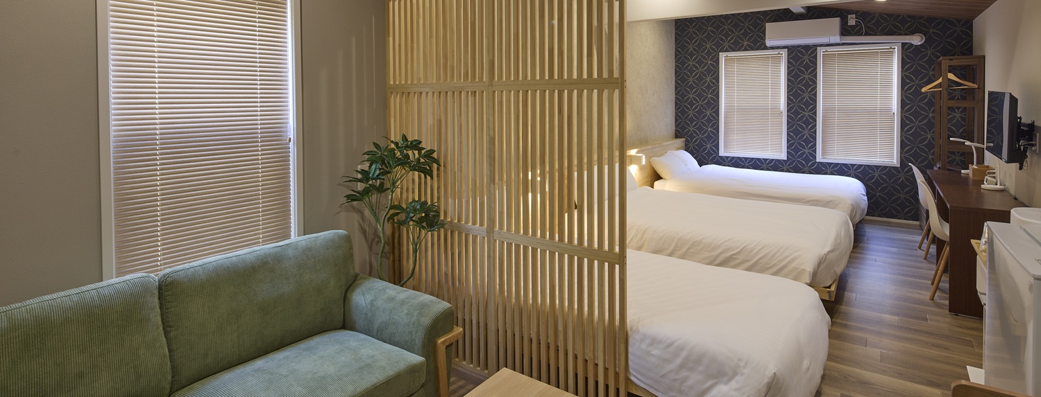 - 1人でお気軽にご利用いただくことはもちろん、ファミリー・カップルなど宿泊施設にもご利用いただけるお部屋をご用意しております。