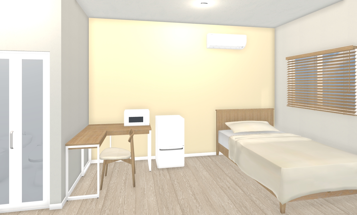 - ユニットバス、冷凍冷蔵庫、電子レンジ、加湿空気清浄機、ケトル、ドライヤー、TV、エアコン、洗濯機