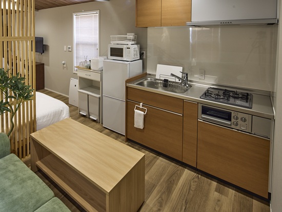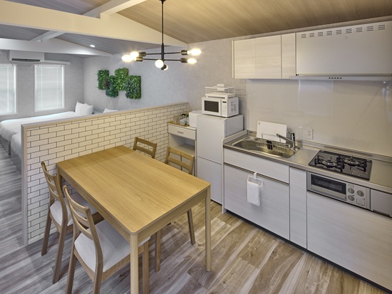 シングルベッドとダブルベッド2台に加え、キッチンと冷凍冷蔵庫を全室装備。