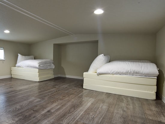 セミダブルベッドと折り畳みマットレス3セットに加え、キッチンと冷凍冷蔵庫、洗濯機を全室装備。