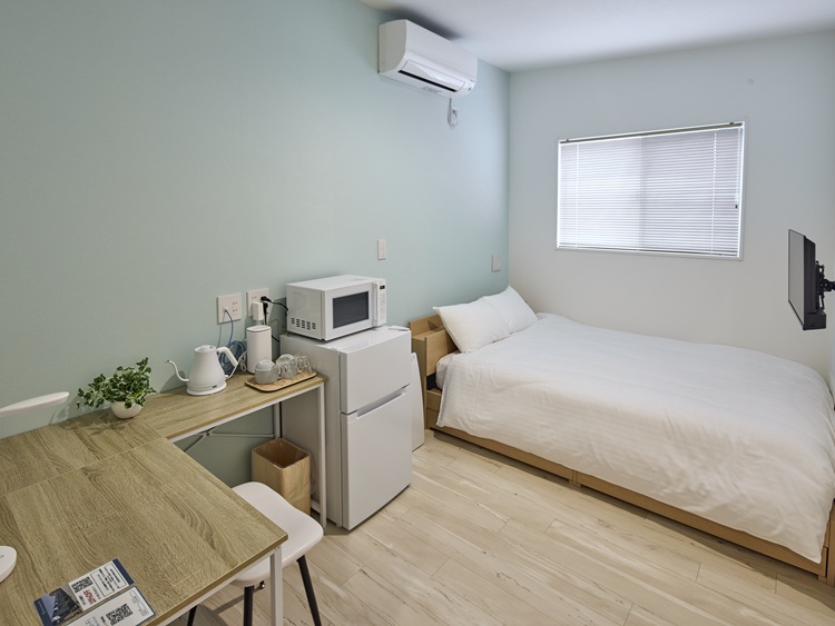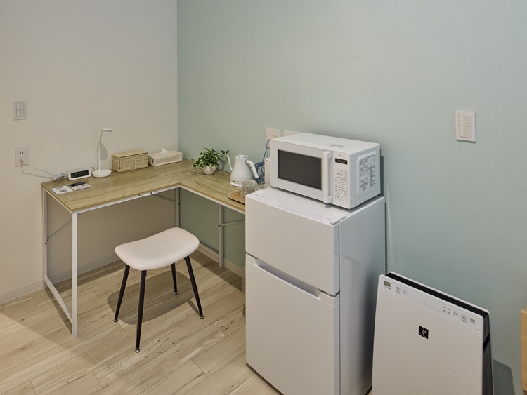 - ユニットバス、冷凍冷蔵庫、電子レンジ、空気清浄機、ケトル、ドライヤー、TV、エアコン