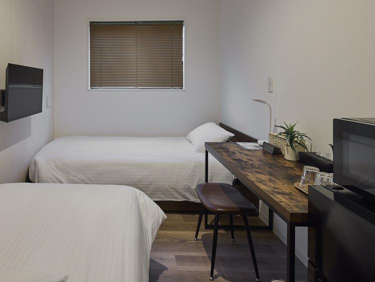 W97×L196サイズのシングルベッド2台に加え、デスクとチェアを全室装備。